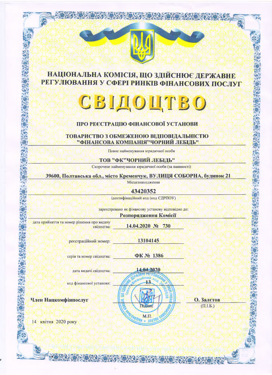 - Найменування: ТОВАРИСТВО З ОБМЕЖЕНОЮ ВІДПОВІДАЛЬНІСТЮ “ФІНАНСОВА КОМПАНІЯ “ЧОРНИЙ ЛЕБІДЬ”;